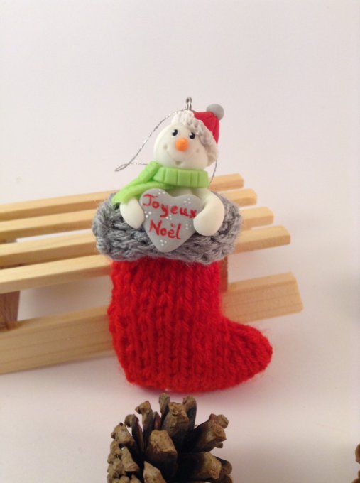 une jolie chaussette rouge et grise dans laquelle s'est caché ce bonhomme de neige...